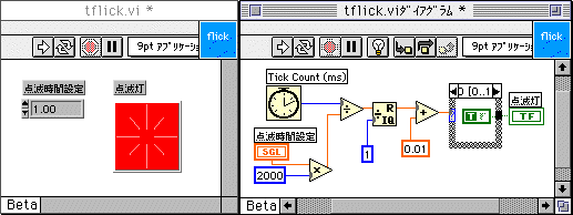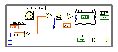 歩行者信号機の点滅,種々の警告灯等に使用しますが,タイマVI作成の時に使用したTick Count.viの応用となります。