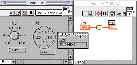 がプローブツールの実行例です。ダイヤグラム上のワイヤの途中でクリックすると,クリックした場所にプローブ番号が表示され,ワイヤを通過するデータがプローブウィンドウ{入力[1]}に表示されます。